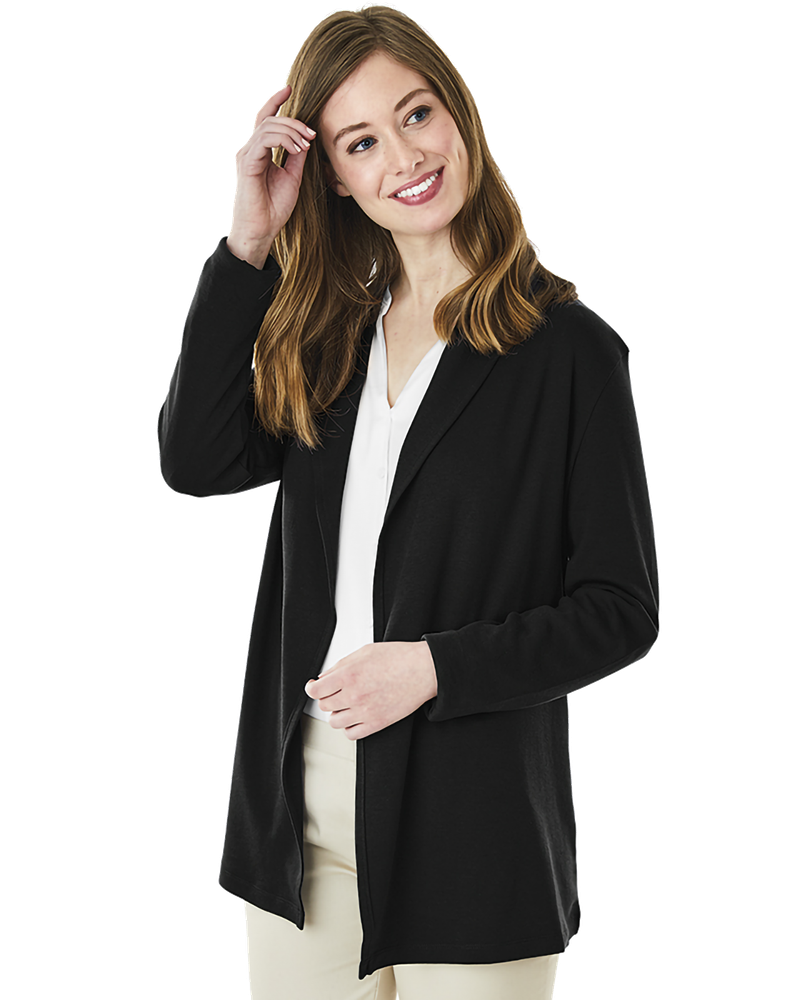 The Women's Cardigan Wrap features 100% soft Supima® cotton (5.60 oz./yd²), offering exceptional softness and a graceful drape.
